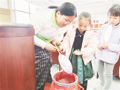 11月22日下午,召陵区实验小学幼儿园分园在天桥街街道滨河路社区党群服务中心开展“童乐暖社区 艺趣伴成长”实践活动。图为社区工作人员与孩子一起制作漆扇。本报记者 范子恒 摄