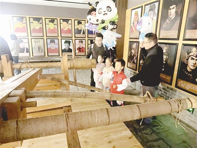 近日,市实验幼儿园组织孩子和家长走进小商桥景区,开展了一场融合历史、文化与自然的亲子实践活动。图为孩子和家长参观冷兵器床弩。彭 钰 摄