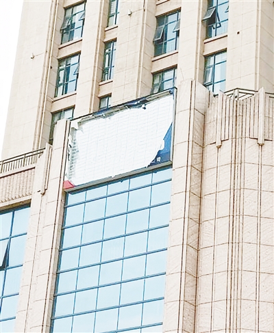 嵩山西支路与会展路交叉口向南约30米路西,建业壹号中心墙体上的广告牌破损。