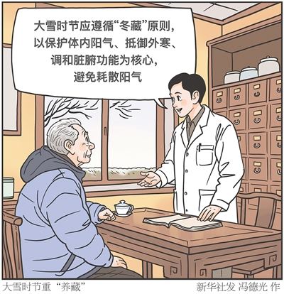 “大雪时节应遵循‘冬藏’原则,以保护体内阳气、抵御外寒、调和脏腑功能为核心,避免耗散阳气。”专家说,饮食应以温补散寒、健脾祛湿为主,推荐适量食用羊肉、牛肉、桂圆、核桃、栗子、山药、薏米、红枣等,忌生冷寒凉,避免加重寒邪与湿气。平素体质实热者应注意清淡饮食,防生“内火”。 新华社发 冯德光 作