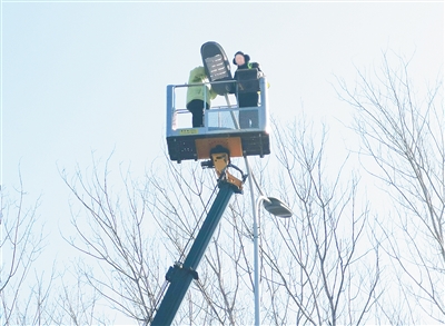 1月7日,市路灯维护中心工作人员冒着严寒在金山路维修路灯。连日来,市路灯维护中心对全市主次干道路灯亮灯情况进行全面排查,并对发现的安全隐患及故障进行及时处理。