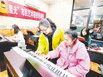 1月8日晚6时30分,室外虽然寒风凛冽,但位于市区海河路舒曼琴行的市文化馆市民艺术夜校培训班内却暖意融融。学员们端坐在琴前,在授课老师常芳的指导下练习指法。看到有的学员指法有偏差,常芳立刻俯身示范纠正,耐心讲解发力技巧。“这是我第三次报名了。从基础乐理到复杂指法,老师用通俗易懂的语言讲解,课下还逐一讲评我们的练习视频。现在《梦中的婚礼》这类有难度的曲子,我也能熟练弹完了。”学员贾怡婧说。