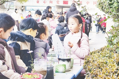②1月7日,源汇区受降路小学举行“做中学、学中做”综合实践活动。图为孩子们分享各自的种植过程。孙焕玲 摄