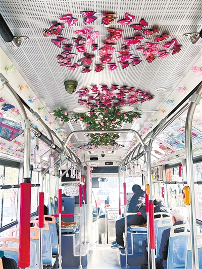 “驾驶员特别用心。这些蝴蝶和花朵能看出他在真心为乘客服务,我很感动。”另一名乘客边赞叹边用手机录下车厢环境,并发布短视频分享,“为公交车驾驶员点赞!”