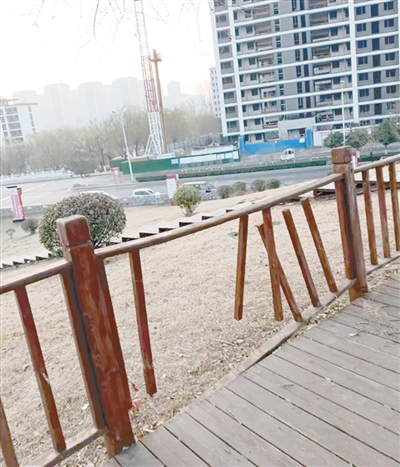 嘉陵江路与九龙山路交叉口向东约100米路北,游园内护栏破损。