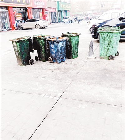 岷江路与井冈山北路交叉口向东约60米路南,垃圾桶脏污。