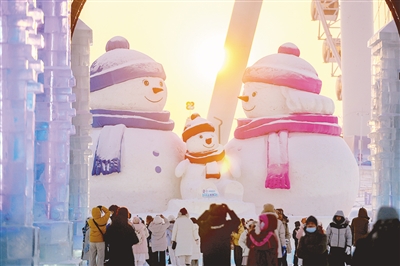 夕阳西下,落日余晖为哈尔滨冰雪大世界披上暖金霞光,游客尽享冬日的浪漫与温柔。