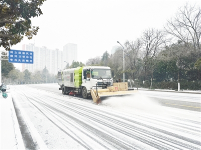 1月19日,我市迎来降雪。当天,我市各部门积极联动,迅速启动应急预案,确保市民生产、生活秩序井然。图为扫雪车在嵩山东支路开展除雪作业。