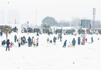 1月19日,受寒潮影响,我市迎来降雪,给停课的孩子们带来了欢乐。图为孩子们在沙澧河风景区玩雪。本报记者 杨 光 摄