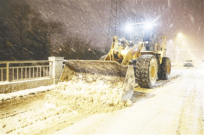 一月十九日夜,铲雪车在嵩山路沙河大桥上持续作业,确保市民出行安全。