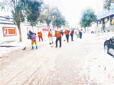 1月20日上午,召陵区翟庄街道大河村村干部带领党员志愿者等清理村内主要路段的积雪。本报记者 张 赢 摄