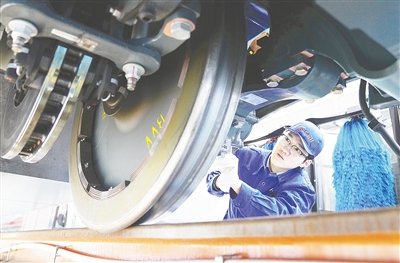 1月20日,中国铁路北京局集团有限公司北京动车段的工作人员在朝阳动车所检修动车组列车。春运临近,中国铁路北京局集团有限公司通过高科技设备加强对动车组司机的模拟实训和动车组列车及轨道线路的检修维护,全力保障旅客平安出行。新华社发
