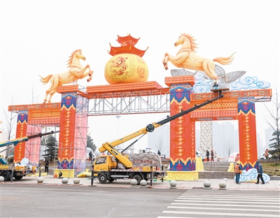 1月29日,在沙澧河风景区银滩公园,工人们正在搭建“双马贺春”彩灯门楼。