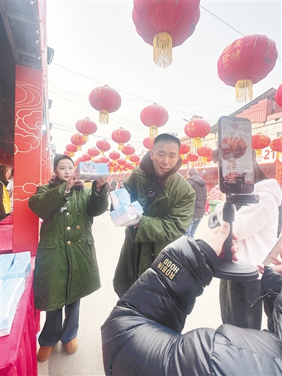 一月二十八日,在舞阳县莲花镇,星光年货节开幕。拥有千万粉丝的网络主播“小飞”(王龙飞)在现场直播带货。本报记者 姚 肖 摄