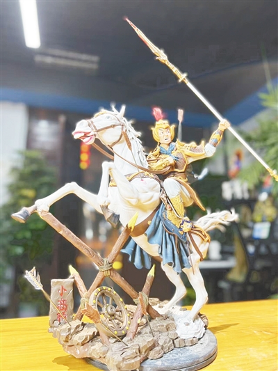 作品中,战马凌空跃起,势如破竹;杨再兴身披金甲,手持长枪,眉宇间英气勃发,无畏凛然。丁大军运用传统手塑技艺,从整体姿态到铠甲纹路、表情线条,皆反复推敲、细致刻画。经过塑形、阴干、烧制、彩绘等多道工序,一块平常无奇的泥土被赋予了灵魂,八百多年前的忠勇将军仿佛穿越时空,在匠人指间重生。