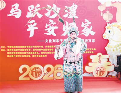 在候车大厅,演员表演了心意六合拳,沙河调传承人陈首凯演唱了《黄鹤楼》选段,吸引旅客纷纷拍照。我市书法家也挥毫泼墨,给旅客义写春联。一位准备回老家过年的旅客张先生激动地说:“这春联写得太好了!这一下子就有了过年的氛围。”
