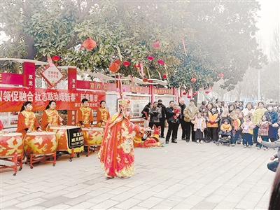 2月5日下午,源汇新区双龙社区举办了集民俗展演、非遗体验、趣味互动于一体的新年集市。图为变脸表演。