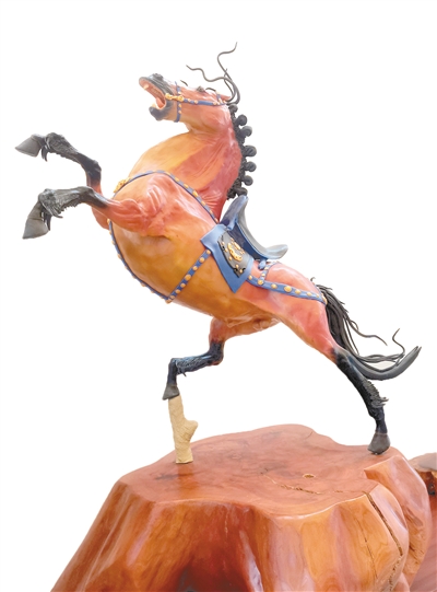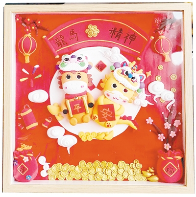 “今年是马年,这匹马寓意奋勇向前、马到成功。”赵闯介绍,这件面塑作品高1.4米、长1米、宽0.7米,从最初设计构思到最终装饰完成,前后经历14道工序,历时约15天完成。制作过程中,他先用铁丝扎出骨架,确定动态与支撑,再用胶带、美纹纸、报纸逐层缠绕塑形,之后覆以特制面泥,通过揉、捏、搓、塑等多种手法逐步刻画出马的肌肉、鬃毛等细节,最后进行上色、风干与装饰,还在局部点缀金粉,让作品在质朴中透出华彩。“马的前蹄腾空,象征奋斗与进取;后蹄踏着云或石,寓意‘步步高升’。马的整体姿态昂首挺胸,体现一种向上的精神。”赵闯说。
