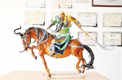 与这件大型面塑骏马作品相隔不远,一件关公骑马的面塑作品《千里走单骑》同样引人驻足。作品生动再现了“千里走单骑”的历史场景:关公绿袍长髯,手提青龙偃月刀,跨下赤兔马低首嘶鸣。人与马的气势融为一体,威风凛凛。