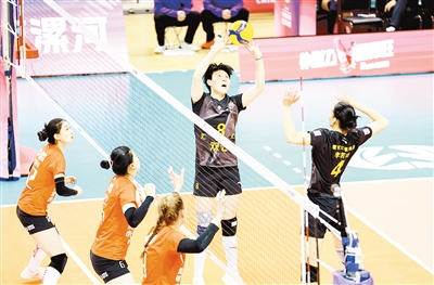 2月7日晚,2025—2026中国女子排球超级联赛赛中升降赛首回合第二场比赛在市体育中心举行。坐镇主场的河南双汇女排以3比0战胜深圳澳洲虎中塞女排。图为河南女排8号张梓涵与4号李若琦进行战术配合。本报记者 杨 光 摄