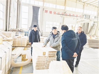 图①漯河市信远达木业有限公司生产车间,企业负责人正在介绍产品。