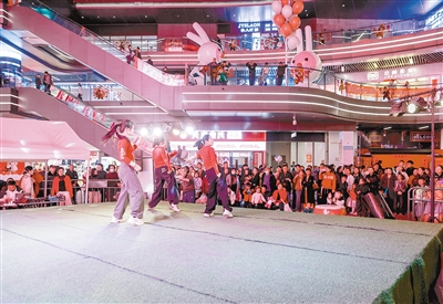 ←2月22日晚,漯河万达广场金街热闹非凡。图为市民在观看文艺表演。