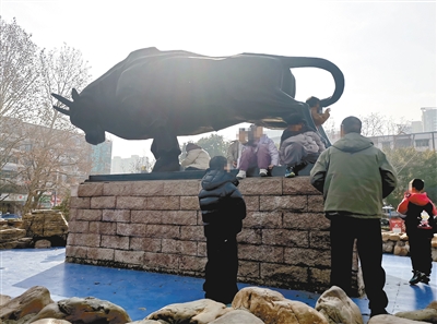 2月23日,在市区黄河广场,一些游客爬上雕像玩耍。本报记者 范子恒 摄