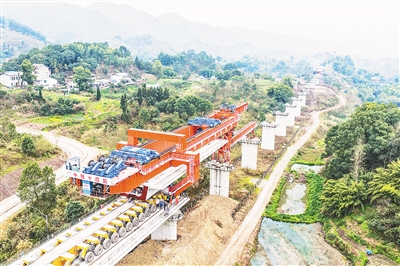 ③2月26日,在重庆市合川区清平镇的西渝高铁建设工地,架梁机在进行架梁作业(无人机照片)。新春伊始,西渝高铁重庆段建设迅速复工复产。 西渝高铁是西安到重庆的高速铁路,全长739公里,设计时速350公里,是我国“八纵八横”高铁网京昆通道和包(银)海通道的重要组成部分。 新华社记者 唐 奕 摄 |