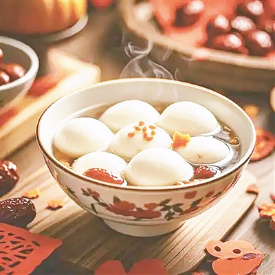 吃元宵是元宵节的一个重要节俗。元宵用糯米细粉制成,圆形,内包核桃仁、芝麻或桂花白糖为馅。江南称为“汤团”,苏州人称为圆子、杭州人称为“上灯圆子”。在祭祀祖先之后,家人一起享用圆子,取其团圆的意义。