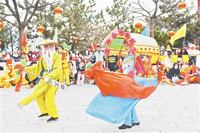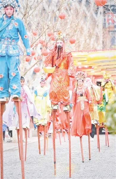 踩高跷是元宵节在民间盛行的一种群众性技艺表演。高跷本属中国古代百戏之一种,早在春秋时已经出现。表演者不但以长木缚于足行走,还能跳跃和舞剑。