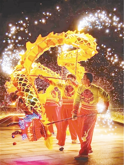 耍龙灯也称舞龙,也叫龙灯舞。它是我国独具特色的传统民间娱乐活动。耍龙灯在我国汉代民间就已相当普遍。唐宋时期的“社火”“舞队”表演中,耍龙灯已是常见的表演形式。耍龙灯的表演,有“单龙戏珠”和“双龙戏珠”两种。在耍法上,各地风格不一,各具特色。