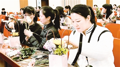 3月4日下午,市纪委监委举办“执纪巾帼心向党 沙澧玫瑰绽芳华”主题活动,喜迎第116个“三八”节。图为纪检监察女干部在进行创意插花。