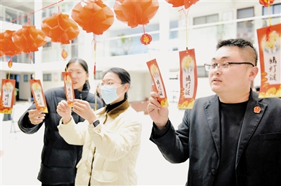 3月2日下午,临颍县人民法院组织开展“元宵共乐 骏马同春”主题游园活动。图为干警们在猜灯谜。张小婷 摄