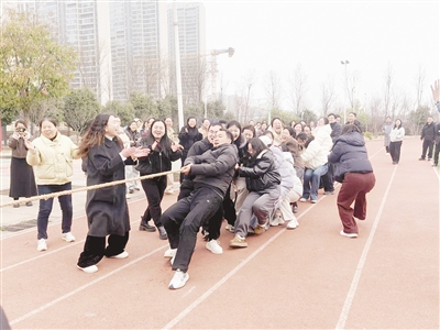 为迎接新学期的到来、丰富教职工业余文化生活,3月4日下午,郾城中学举办教职工春季拔河比赛。 潘 琼 摄