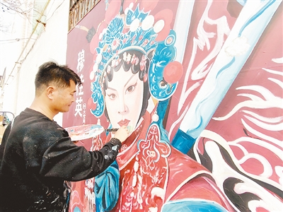 走近这幅墙绘,记者感受到扑面而来的戏曲神韵。刀马旦穆桂英的飒爽英姿被刻画得栩栩如生,仿佛从豫剧舞台上直接跃然墙面:穆桂英头戴蓝底凤冠,冠上珍珠、绒球、珠花错落点缀;面部采用豫剧经典扮相,柳叶眉高挑上扬,双目炯炯有神,眉宇间尽显果敢与威严,透着巾帼不让须眉的气场。墙绘师刘红宝一只手紧握毛刷,另一只手端着颜料盘,专注地对画面细节进行修补。