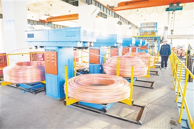 春潮涌动启新程,实干担当正当时。3月9日,位于中原铜基新材料产业园的漯河金普森金属科技有限公司(以下简称金普森科技)生产车间内,机器轰鸣声不绝于耳,智能化生产线正满负荷运转。一根根铜线经过拉丝、退火、绞线等工序,变成一批批可交付的产品。