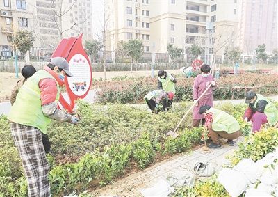 3月18日,在泰山路与会展路交叉口口袋公园,市城管局园林绿化养护中心组织工人补栽苗木。