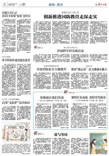 本报讯(记者 李文姣 通讯员 田向阳)近年来,郾城区太行山路小学坚守育人初心,深耕国防教育阵地,创新构建“思政引领、科技赋能、实践体验、家校共育、文化浸润”五位一体育人模式,举办一系列特色鲜明、务实有效的教育活动,厚植学生家国情怀,磨砺意志,走出一条独具特色的校园国防教育新路子。