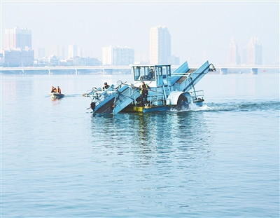 3月22日,在河南省南阳市白河槐香湾水域,工人驾驶大型清漂割草船在河面上清理水草。