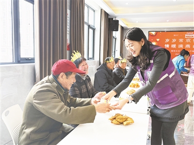 3月20日,在召陵区翟庄街道燕山路社区新时代文明实践站,社区工作人员为辖区65岁以上老人举办集体生日宴。