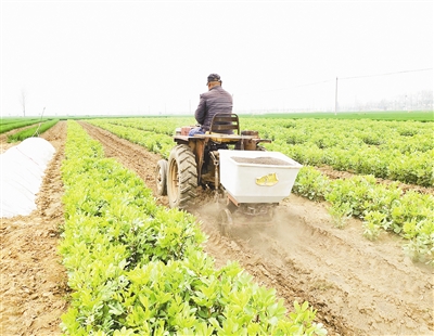 随着气温稳步回升,我市农民积极开展春耕春管工作。3月25日,在郾城区商桥镇坡边村的蚕豆地里,村民正忙着施肥,田间地头一派繁忙景象。本报记者 范子恒 摄