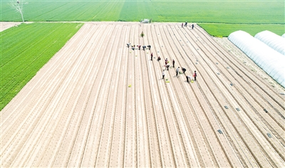 左图:3月25日,河南省商丘市夏邑县会亭镇郭楼村农民在田间栽植中药材(无人机照片)。 新华社发 王高超 摄
