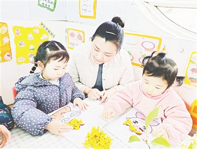 3月19日,召陵区实验小学幼儿园分园开展春季区域活动。图为美工区的小朋友在老师指导下,用花朵为人物进行发型设计。本报记者 姚晓晓 摄