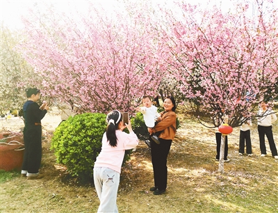 ↑3月28日,市民在沙澧河风景区红枫广场拍照。连日来,沙澧河风景区海棠花竞相绽放,吸引众多市民踏青赏春。本报记者 范子恒 摄