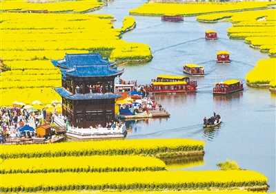 时下,江苏省兴化市千垛景区的油菜花进入盛花期,吸引众多市民游客前来踏青赏花,放松身心。