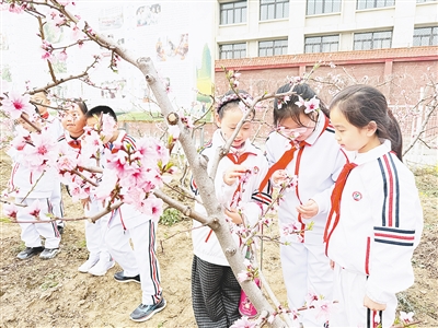 3月25日,市实验小学学生走进该校劳动实践基地,举办第三届桃花节实践活动。图为学生在观察桃花。申会平 摄