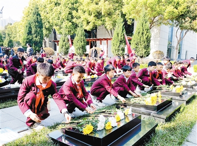 4月1日,漯河小学组织教师、学生到市烈士陵园开展清明祭英烈活动。图为学生代表向烈士敬献鲜花。本报记者 范子恒 摄