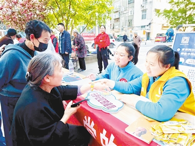 4月1日下午,市民政局、源汇区顺河街街道建设西路社区联合市幸福沙澧社区服务中心等爱心组织举办“智爱沙澧 守护老人记忆”公益活动。图为市幸福沙澧社区服务中心的工作人员为老人讲解黄手环的用途。