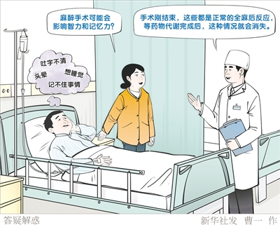 有些人认为麻醉手术后脑子会变笨、变傻,其实是手术刚结束,从全麻苏醒过来的人会头晕、想睡觉、吐字不清、记不住事情。“这些都是正常的全麻后反应,等药物代谢完成后,这种情况就会消失。”中国心胸麻醉学会理事、浙江大学医学院附属第一医院(浙大一院)麻醉科主任苏殿三说。新华社发 曹 一 作