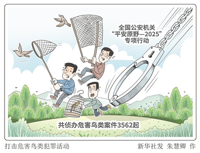 记者4月1日从公安部新闻发布会上获悉,公安部部署全国公安机关开展“平安原野—2025”专项行动期间,全国公安机关依法严厉打击危害国家保护鸟类等野生动物犯罪活动,共立案侦办危害鸟类案件3562起。新华社发 朱慧卿 作